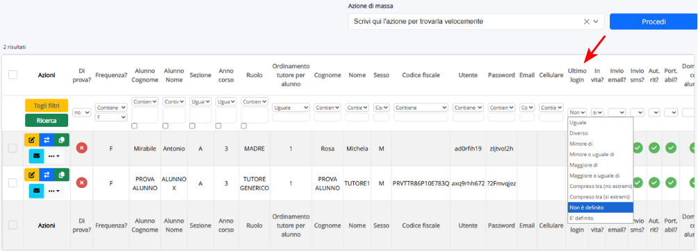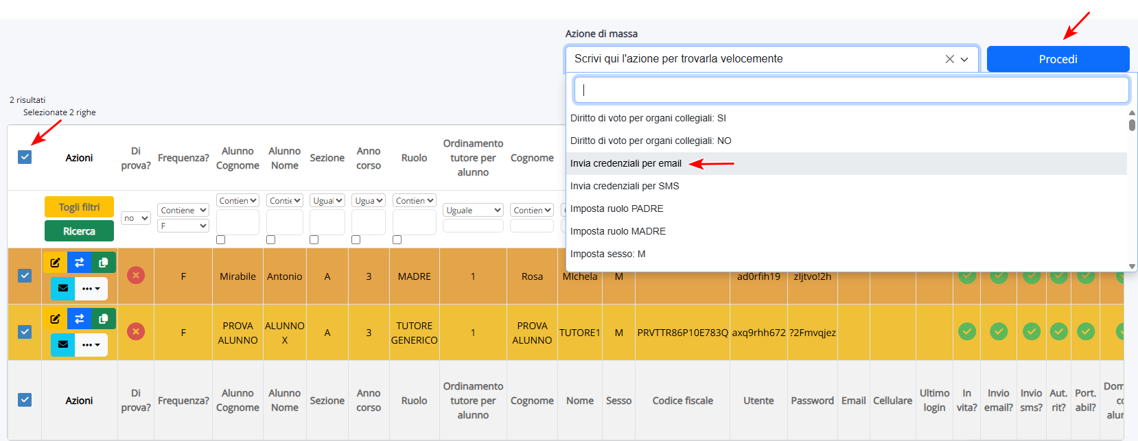 In alto a destra, sopra la tabella, nel menù a discesa di "Azione di massa", scegliere la voce “Invia credenziali per email” e cliccare sul pulsante “Procedi”.