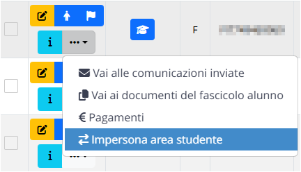 In corrispondenza di ogni alunno si trova il pulsante con i tre puntini, dopo averlo cliccato, selezionare la voce "Impersonare area studente".