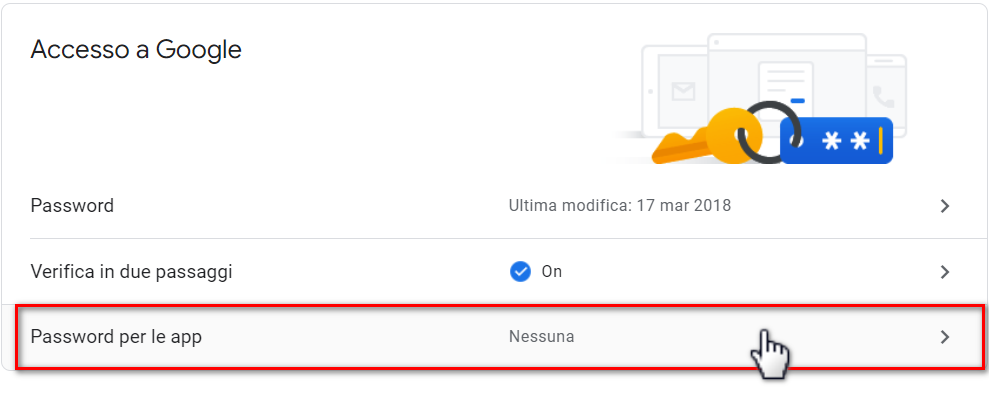 Sempre all'interno della videata "Sicurezza" del proprio account Google, scendere in basso e cliccare sulla riga "Password per le app"