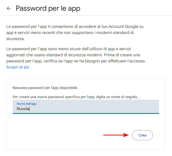 Cliccare sulla tendina "Seleziona app" e selezionare il valore Altra (nome personalizzato). Scrivere il nome "Nuvola" e cliccare sul pulsante "Crea"