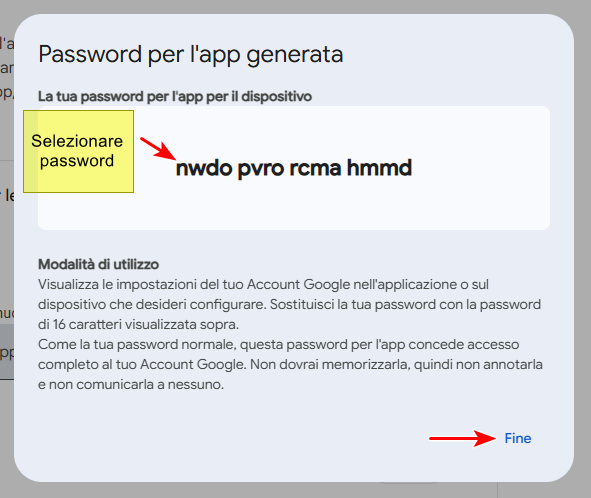 Selezionare "La tua password per l'app per il dispositivo", click con il tasto destro del mouse, poi "Copia". Infine chiudere la schermata tramite il pulsante "Fine".