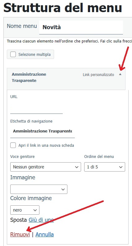 4. Espandiamo la voce "Amministrazione trasparente" e clicchiamo su Rimuovi
