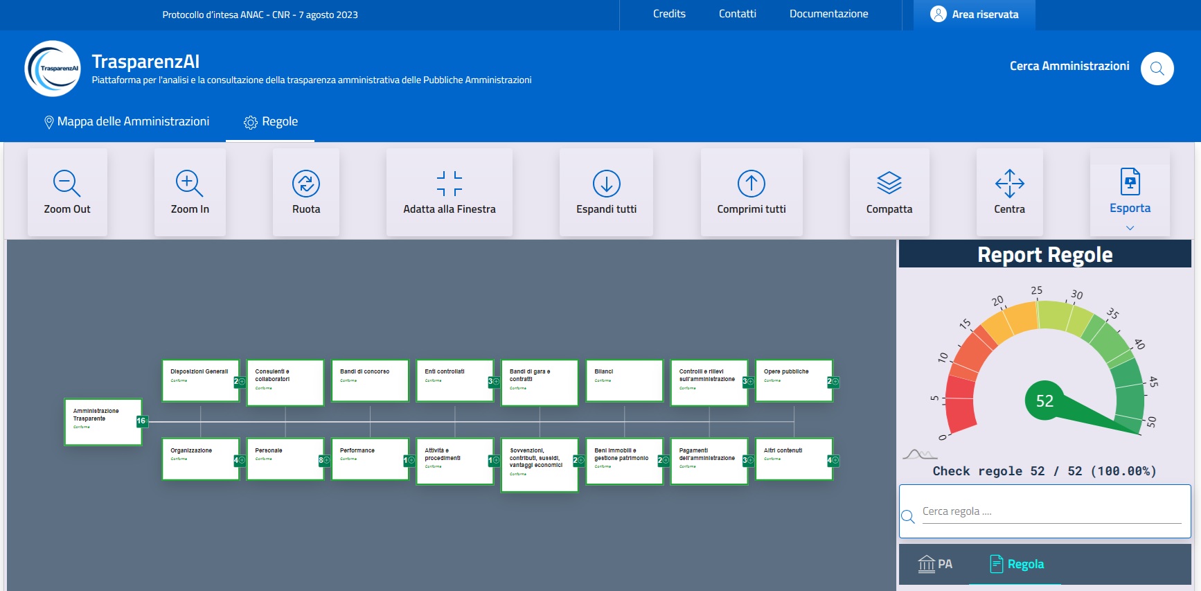 La scherma successiva mostrerà l'alberatura delle voci presenti in Amministrazione Trasparente. Un risultato ottimale deve mostrare tutte le voci bordate di colore verde e un punteggio di 52 su 52