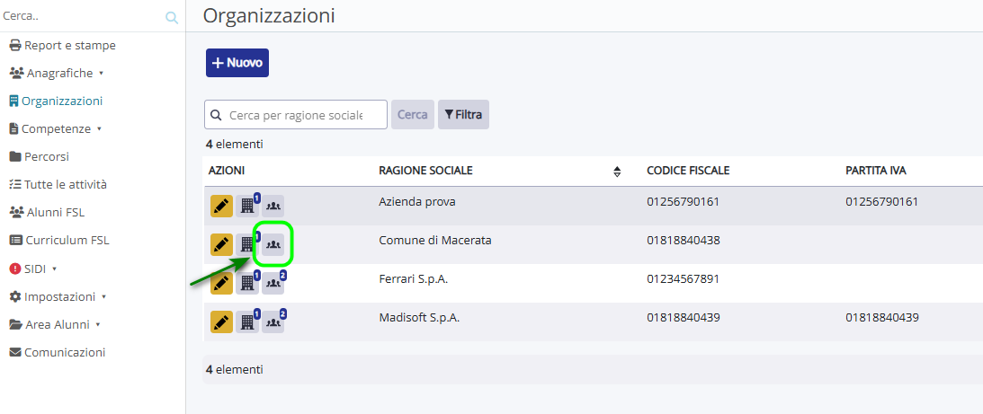 Oppure, si può procedere dalle Organizzazioni. Cliccando sulla terza icona, infatti, verremo rimandati all'elenco dei tutor aziendali collegati ad un'organizzazione, con la possibilità di crearne di nuovi.