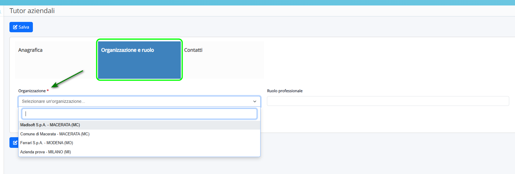 Nella sezione Organizzazione e ruolo dovrà essere specificata, obbligatoriamente, l'organizzazione a cui il Tutor è abbinato e, in caso, indicato il ruolo professionale ricoperto.