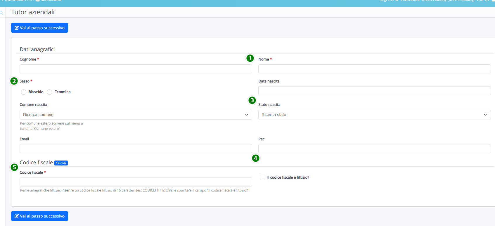 I campi obbligatori per la creazione dell'anagrafica del tutor aziendale sono: