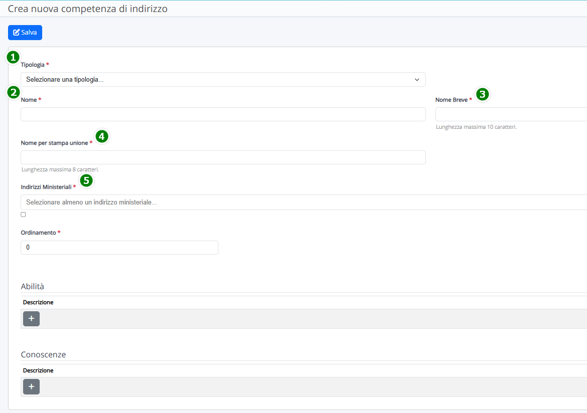 3. / 4. Un nome breve e un nome per stampa unione (possono essere uguali tra di loro, ma univoci tra le varie competenze di indirizzo).