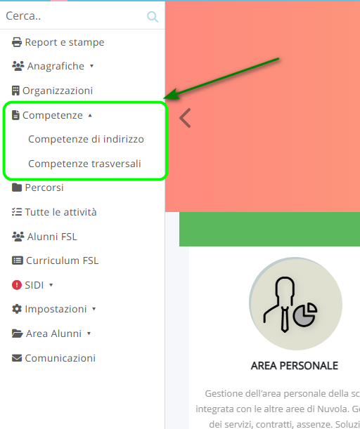 Per inserire le competenze in Nuvola è necessario accedere all'area di lavoro FSL e, dal menù sinistro principale, cliccare su Competenze e scegliere quale inserire.