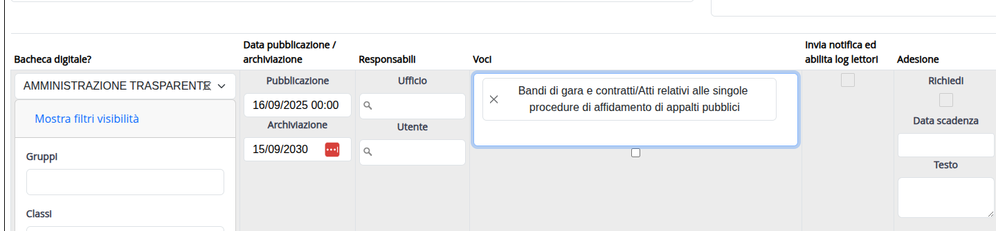 procedere alla pubblicazione in bacheca Amministrazione Trasparente utilizzando la voce "Bandi di gara e contratti/Atti relativi alle singole procedure di affidamento di appalti pubblici"