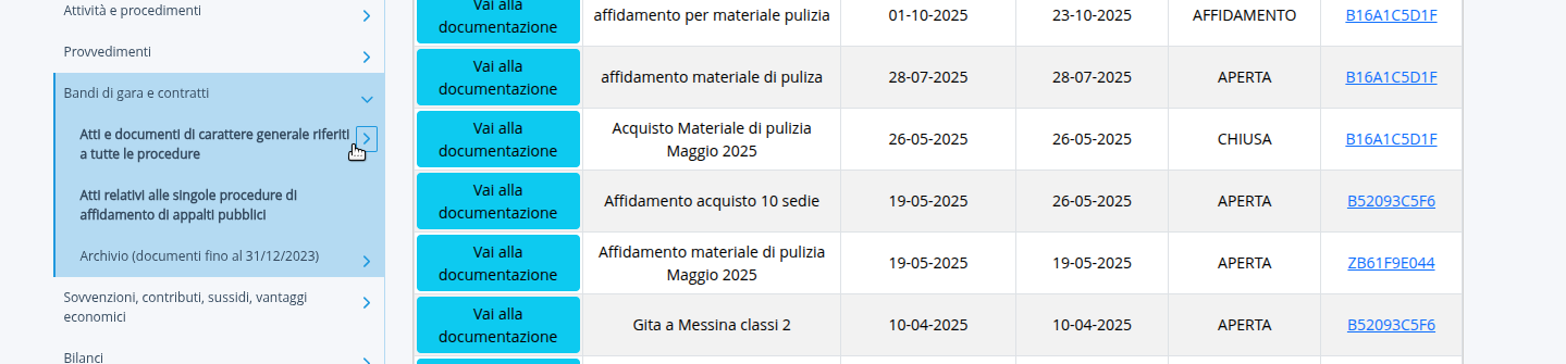 In Amministrazione Trasparente nella sezione "Bandi di gara e Contratti/Atti relativi alle singole procedure di affidamento di appalti pubblici", ogni procedura viene pubblicata distintamente come nell'immagine che segue: