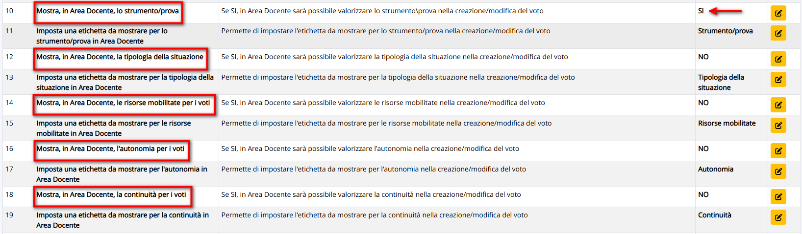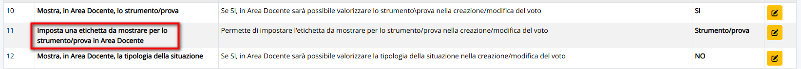 Nell'elenco delle impostazioni disponibili è ora possibile gestire le opzioni per definire le etichette dei criteri di valutazione in itinere, che saranno poi mostrate nell'Area Docente durante la creazione/modifica del voto.