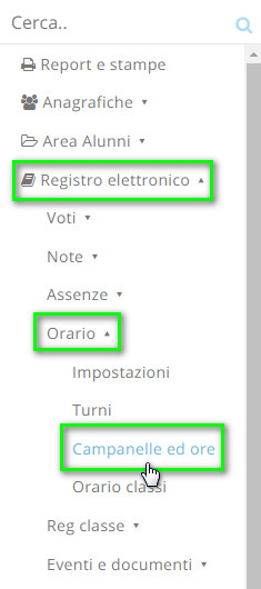 Per impostare le campanelle specifiche per alunno occorre andare in "Registro elettronico" -> "Orario" -> "Campanelle ed ore".