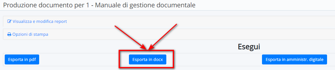 2) Successivamente alla produzione del report ci sarà consentito di scegliere in che formato estrapolare il report, consigliamo fortemente l'uso del formato .docx al fine di far rispettare l'impaginazione data da Nuvola