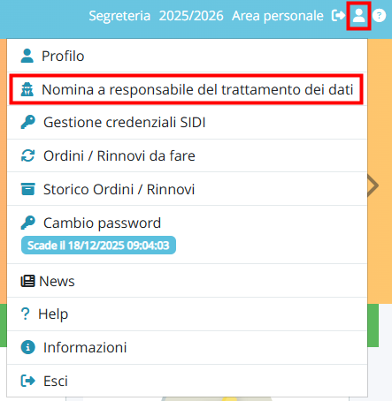 Per poter nominare il responsabile del trattamento dei dati personali, da qualsiasi area di Nuvola, cliccare sul mezzo busto in alto a destra e scegliere la voce "Nomina a responsabile del trattamento dei dati personali"