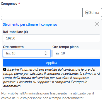 Nel campo "Compenso" è possibile inserire il costo stimato del contratto: in base alla fascia stipendiale e alla durata è possibile inserire il compenso del contratto. Se viene inserito, Nuvola potrà calcolare in automatico i costi del personale non a tempo indeterminato, già strutturato per trimestri, come richiede la normativa.