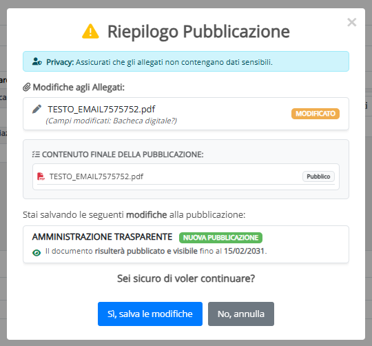 Prestare particolare attenzione alla sezione "Aree ed allegati", dove si troverà la spunta alla voce "Bacheca digitale?" che indicherà gli allegati che saranno pubblicati;